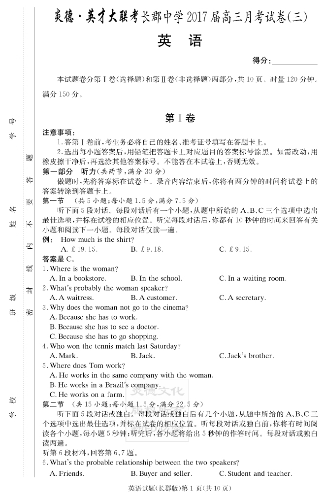 【英語】炎德英才大聯(lián)考2017長郡中學(xué)高三3次月考