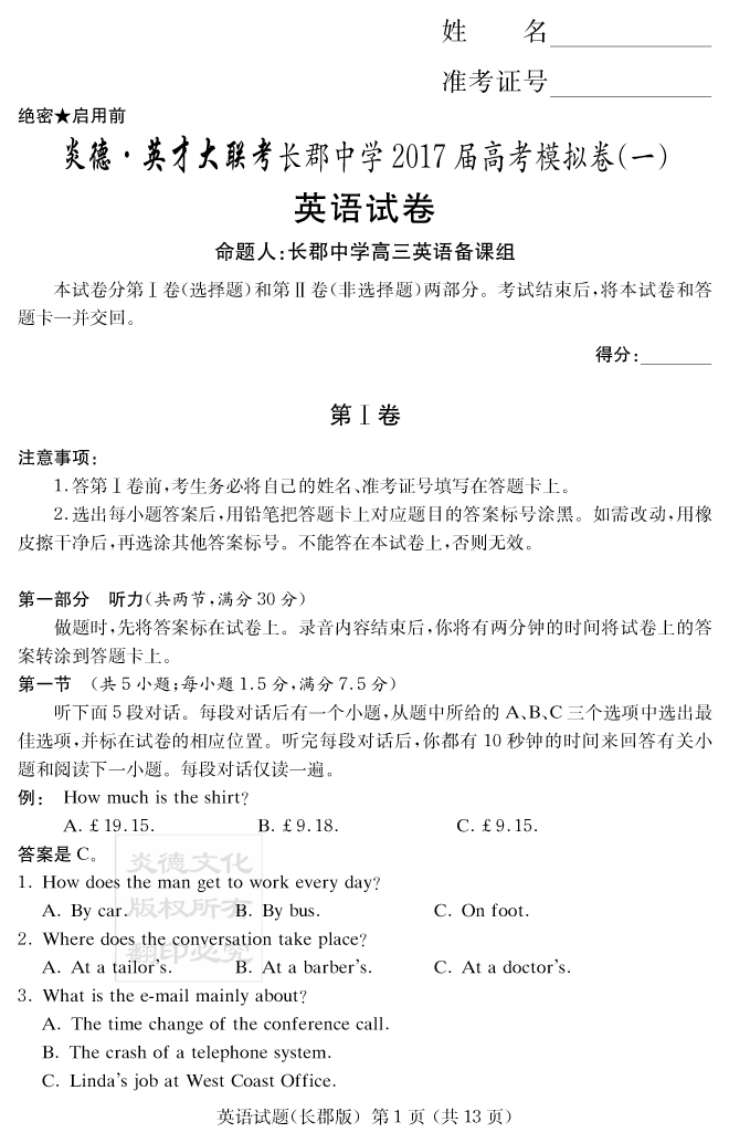 【英語】炎德英才大聯考2017長郡中學高三9次月考(模擬一)