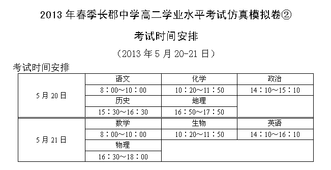 2013年春季長(zhǎng)郡中學(xué)高二學(xué)業(yè)水平考試仿真模擬卷②考試時(shí)間范圍(2013.05.20-21)