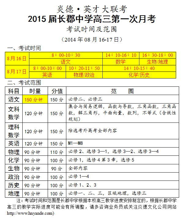炎德英才大聯(lián)考長郡中學(xué)2015屆高三第1次月考考試時間和范圍(2014.08.16-17最新)