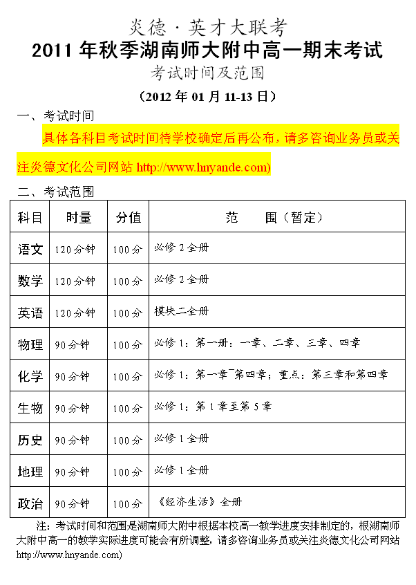 2011秋季湖南師大附中高一期末考試時間和范圍