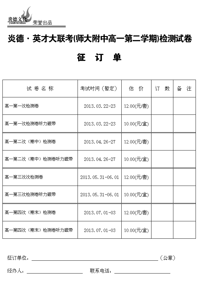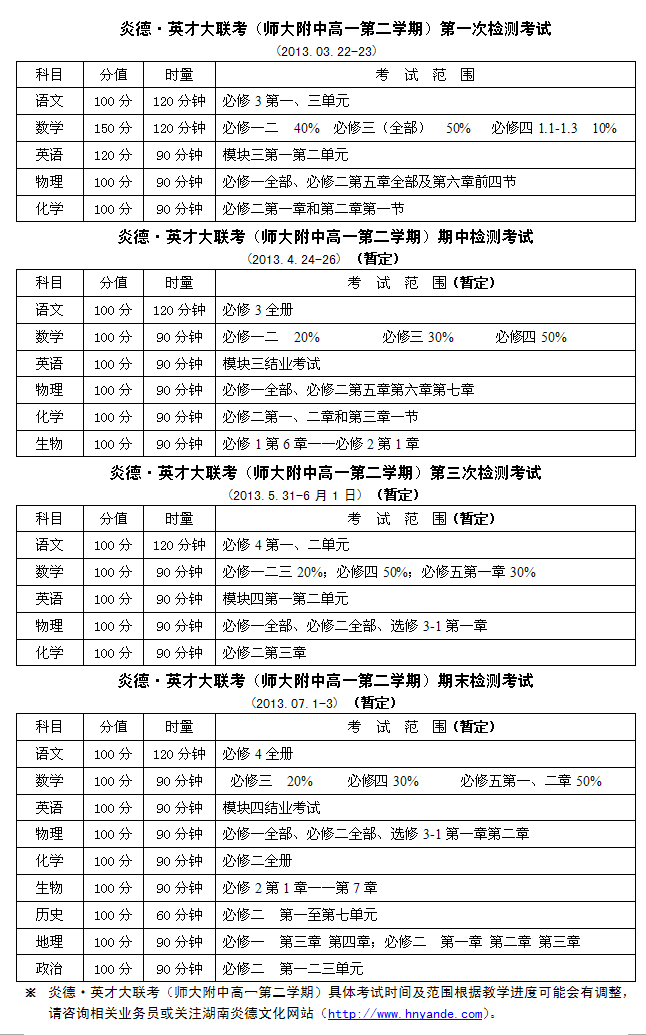 2013年春季師大附中高一月考時間范圍訂單(2013.03-07)