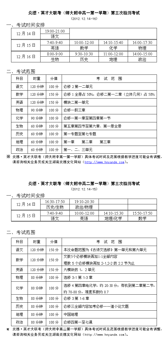2012年秋季師大附中高一高二第三次月考時間范圍(2012.12.15-16)