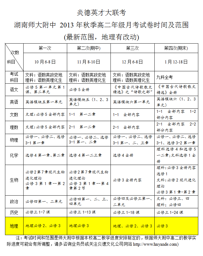 炎德英才大聯考師大附中2013年秋季高二年級月考試卷考試時間和范圍(第1-4次)