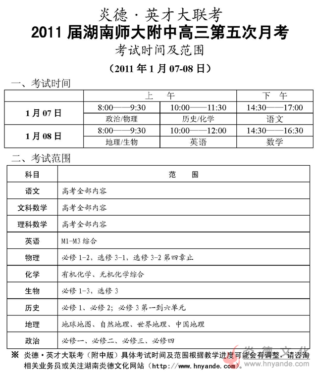 炎德英才大聯考湖南師大附中2011屆高三第五次月考考試時間和范圍