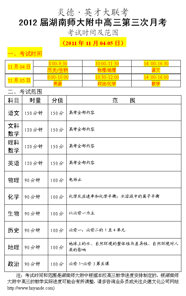 炎德英才大聯考湖南師大附中2012屆高三第三次月考考試時間和范圍
