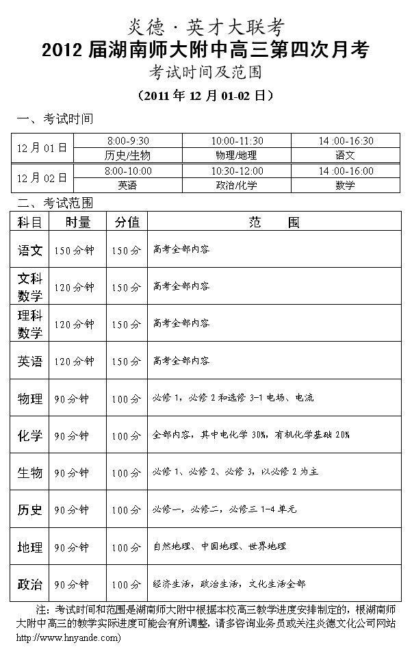 炎德英才大聯考湖南師大附中2012屆高三第四次月考考試時間和范圍
