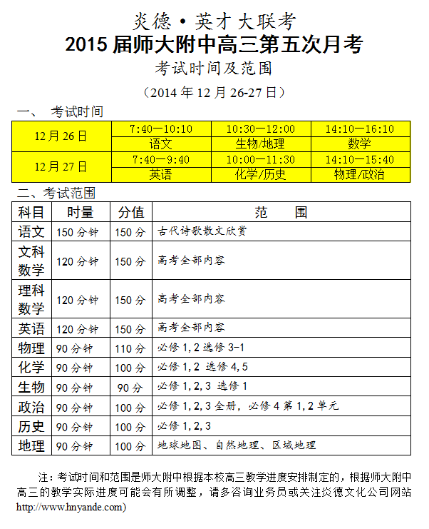 炎德英才大聯考師大附中2015屆高三第5次月考考試時間和范圍(2014.12.26-27)