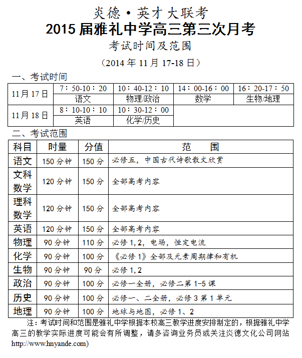 下一篇:炎德英才大聯考雅禮中學2015屆高三第4次月考考試時間和范圍(2014.12.20-21)