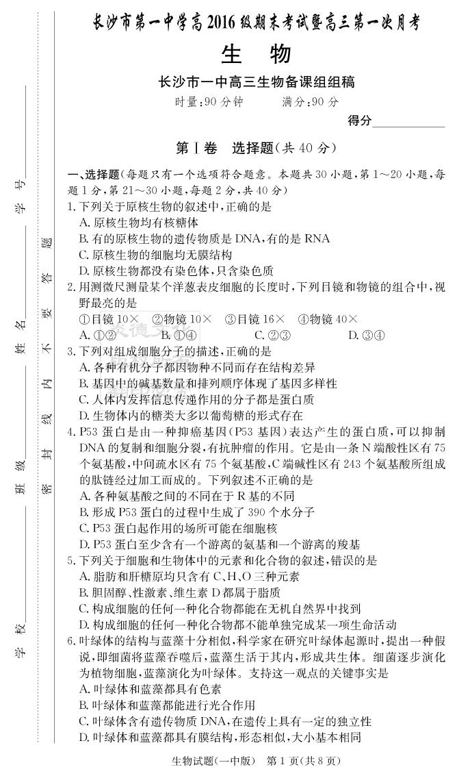 【生物】炎德英才大聯考2019長沙一中高三1次月考