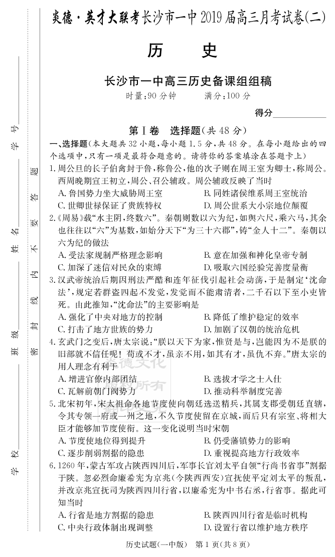 【歷史】炎德英才大聯考2019長沙一中高三2次月考