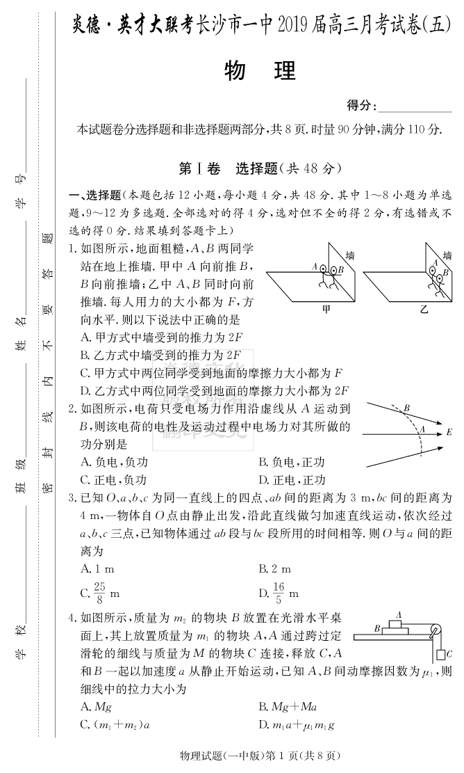 【物理】炎德英才大聯(lián)考2019長(zhǎng)沙一中高三5次月考