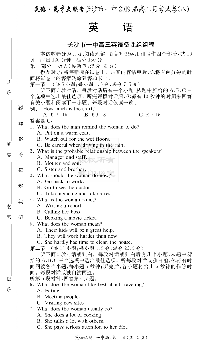 【英語】炎德英才大聯(lián)考2019長沙一中高三8次月考