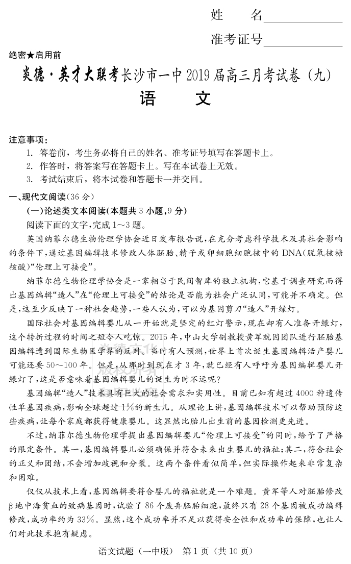 【語文】炎德英才大聯考2019長沙一中高三9次月考
