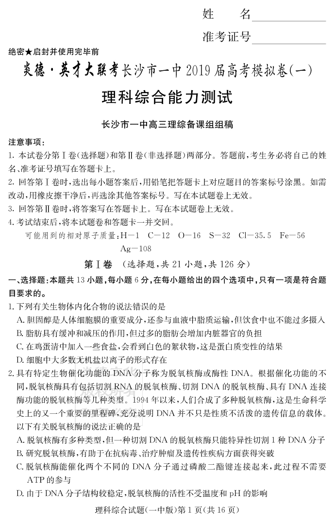【理綜】炎德英才大聯考2019長沙一中高三10次月考(模擬一)