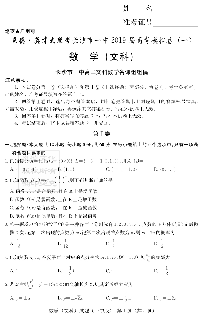 【文數】炎德英才大聯考2019長沙一中高三10次月考(模擬一)