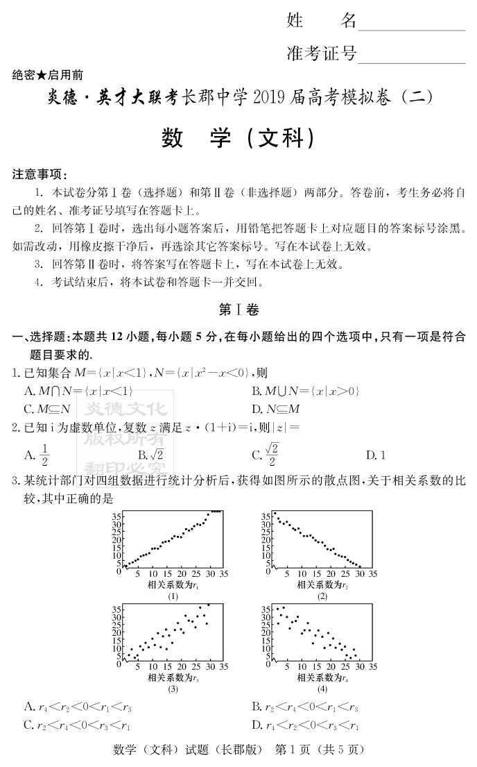 【文數】炎德英才大聯考2019長郡中學高三10次月考(模擬二)