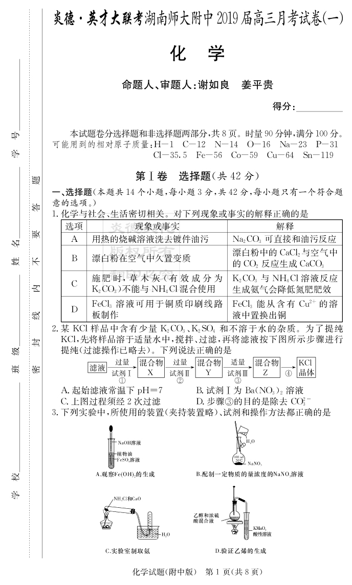 【化學】炎德英才大聯考2019師大附中高三1次月考
