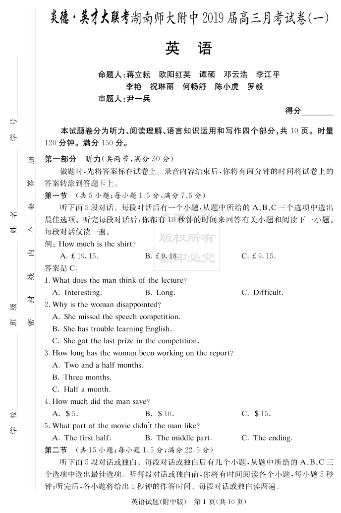 【英語(yǔ)】炎德英才大聯(lián)考2019師大附中高三1次月考
