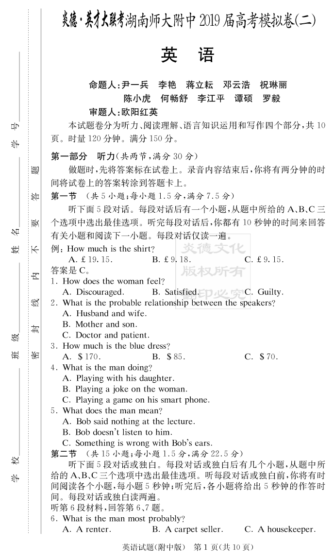【英語(yǔ)】炎德英才大聯(lián)考2019師大附中高三9次月考(模擬二)