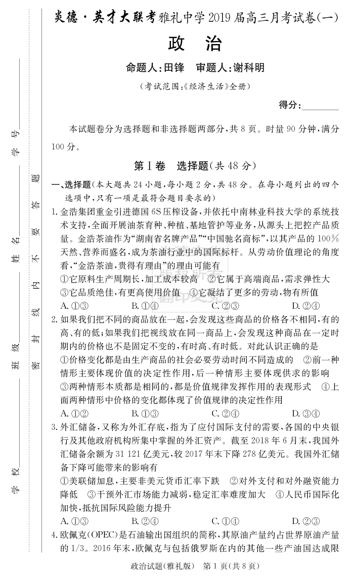 【政治】炎德英才大聯考2019雅禮中學高三1次月考