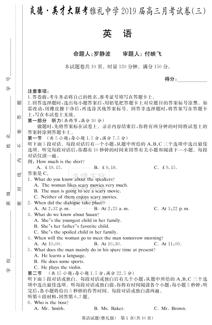 【英語】炎德英才大聯(lián)考2019雅禮中學高三3次月考