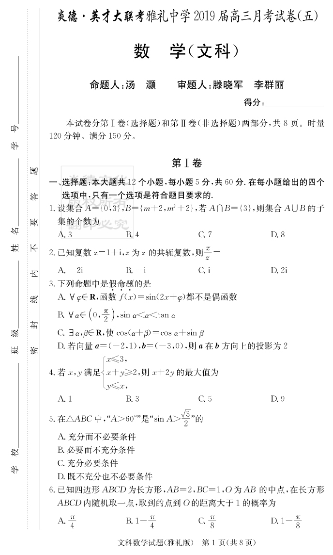 【文數(shù)】炎德英才大聯(lián)考2019雅禮中學高三5次月考