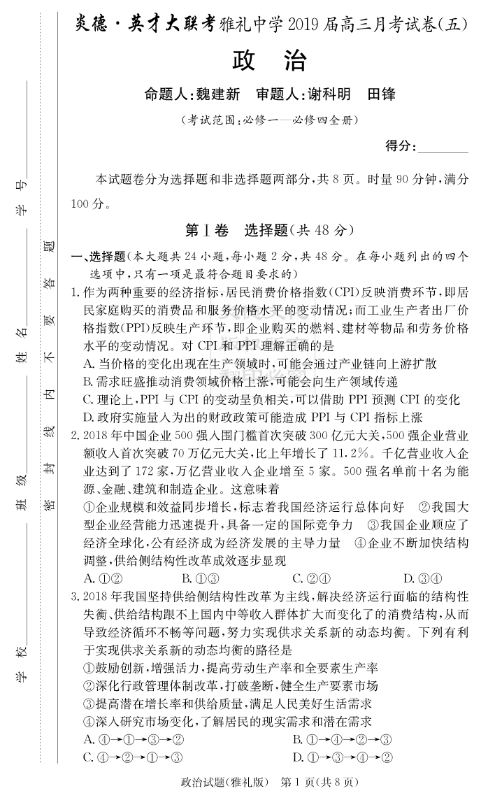 【政治】炎德英才大聯考2019雅禮中學高三5次月考