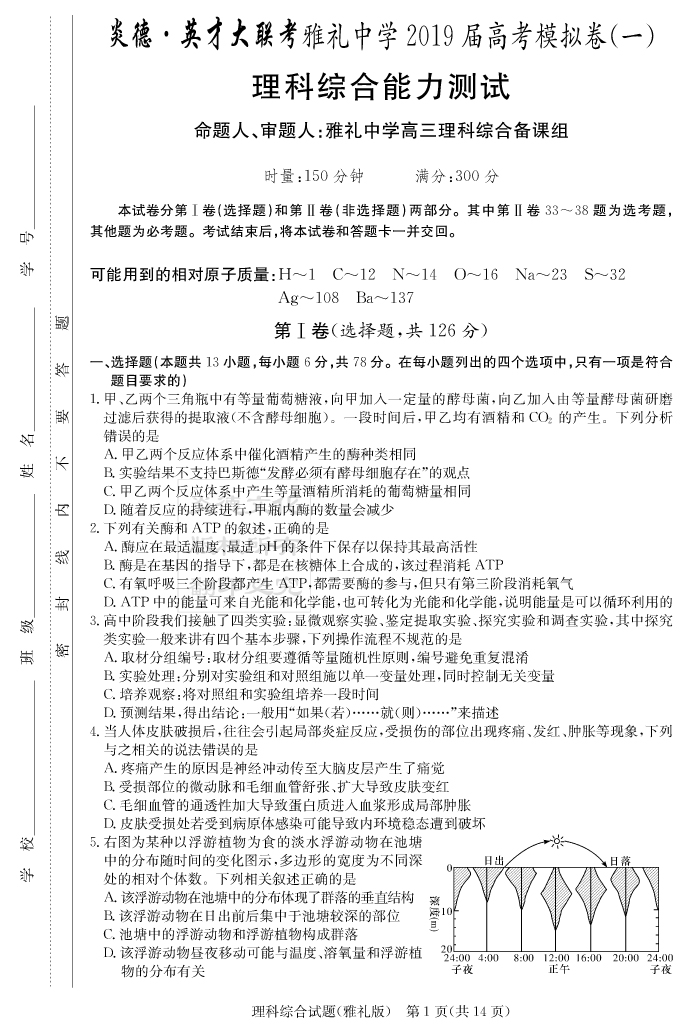 【理綜】炎德英才大聯考2019雅禮中學高三9次月考(模擬一)