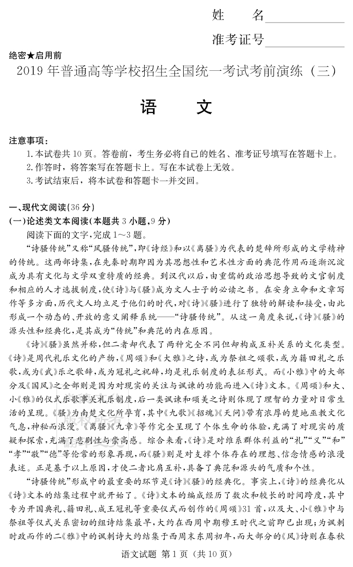 【語文】2019年普通高等學校招生全國統(tǒng)一考試考前演練(三)