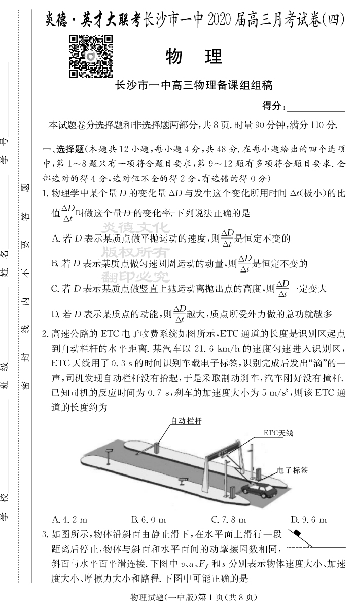 【物理】炎德英才大聯考2020屆長沙市一中高三4次月考