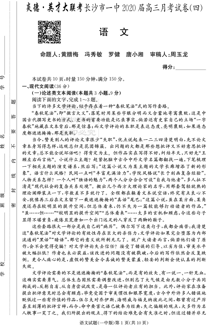 【語文】炎德英才大聯考2020屆長沙市一中高三4次月考
