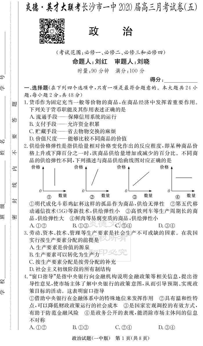【政治】炎德英才大聯(lián)考2020屆長沙市一中高三5次月考