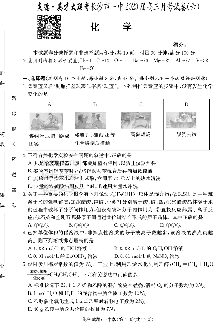 【化學】炎德英才大聯考2020屆長沙市一中高三6次月考