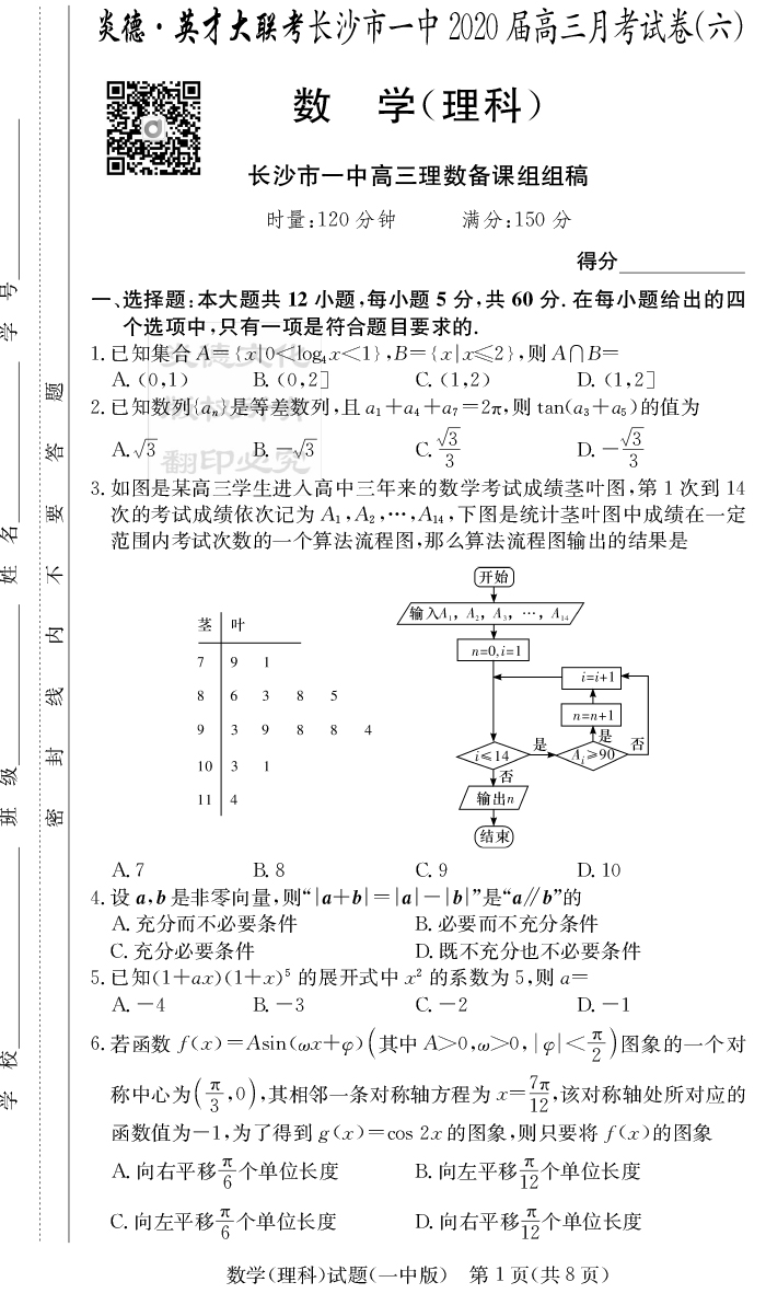 【理數】炎德英才大聯考2020屆長沙市一中高三6次月考