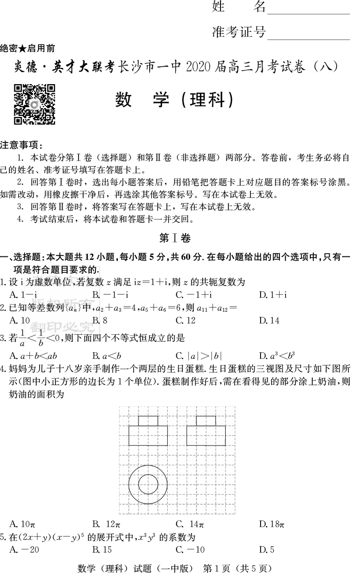 【理數】炎德英才大聯考2020屆長沙市一中高三8次月考