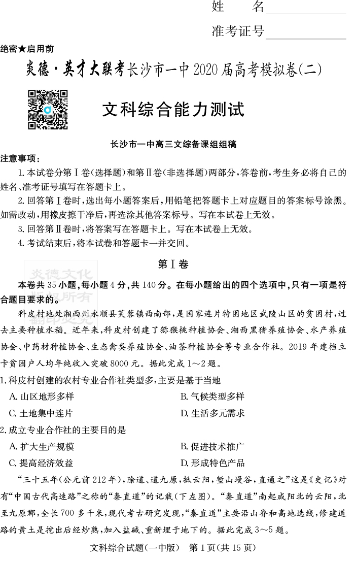 【文綜】炎德英才大聯考2020屆長沙市一中高三10次月考(模擬二)