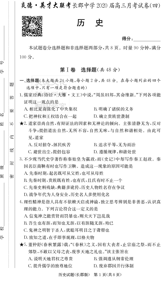 【歷史】炎德英才大聯考2020屆長郡中學高三4次月考