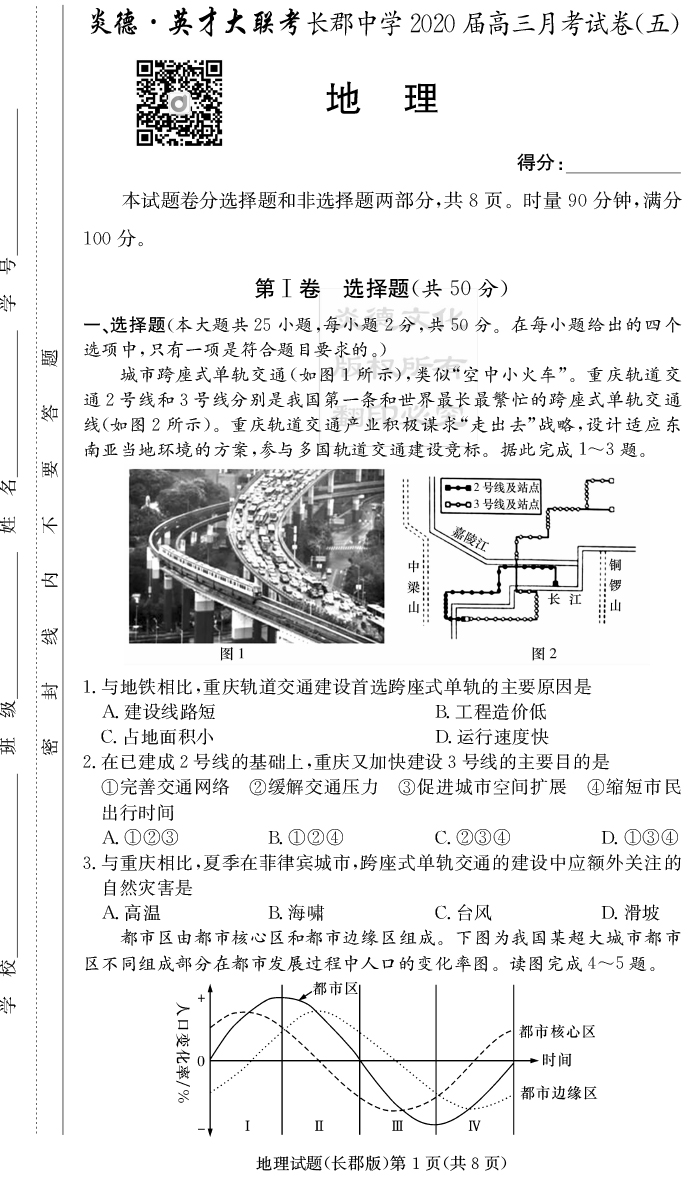 【地理】炎德英才大聯考2020屆長郡中學高三5次月考