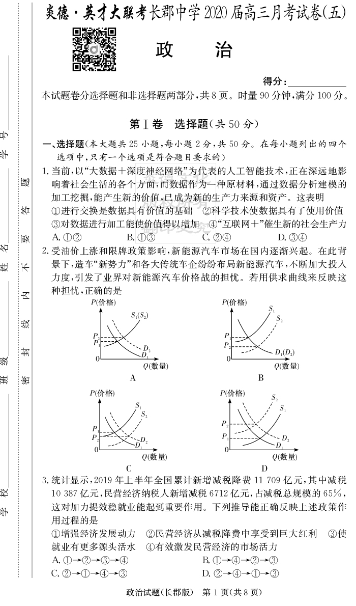 【政治】炎德英才大聯考2020屆長郡中學高三5次月考