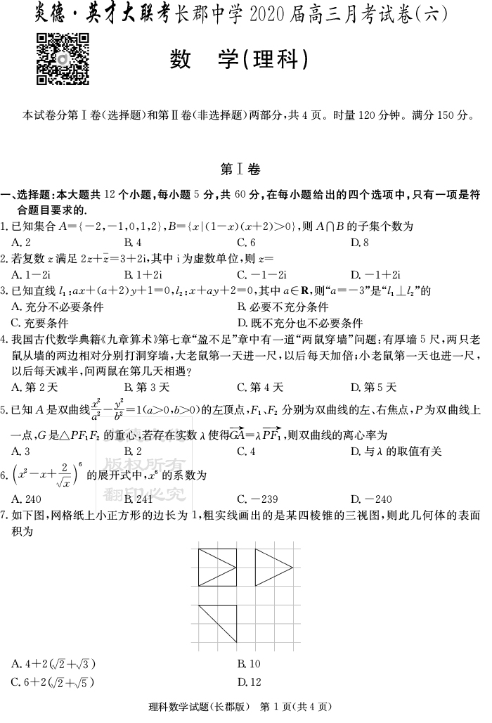 【理數】炎德英才大聯考2020屆長郡中學高三6次月考