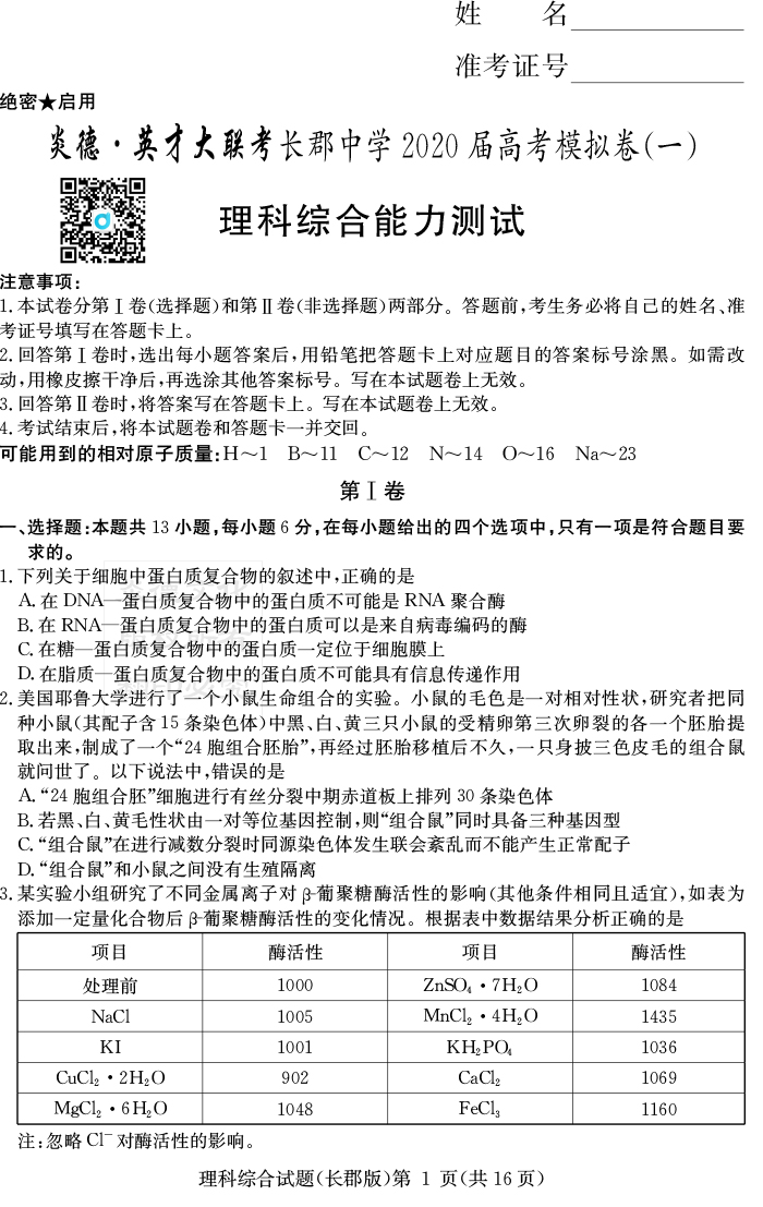 【理綜】炎德英才大聯考2020屆長郡中學高三9次月考(模擬一)