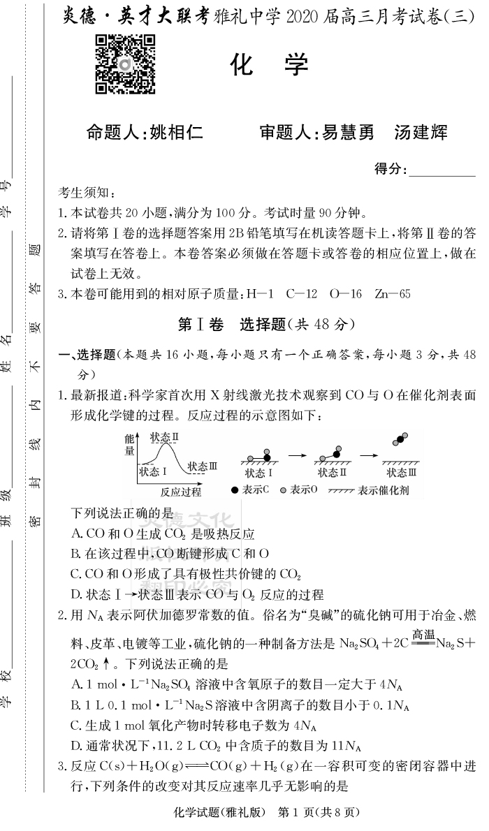 【化學】炎德英才大聯考2020屆雅禮中學高三3次月考