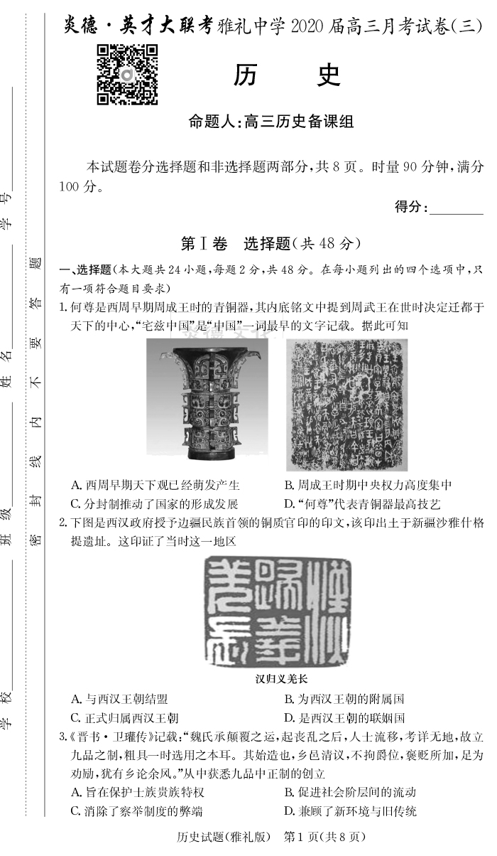【歷史】炎德英才大聯(lián)考2020屆雅禮中學(xué)高三3次月考