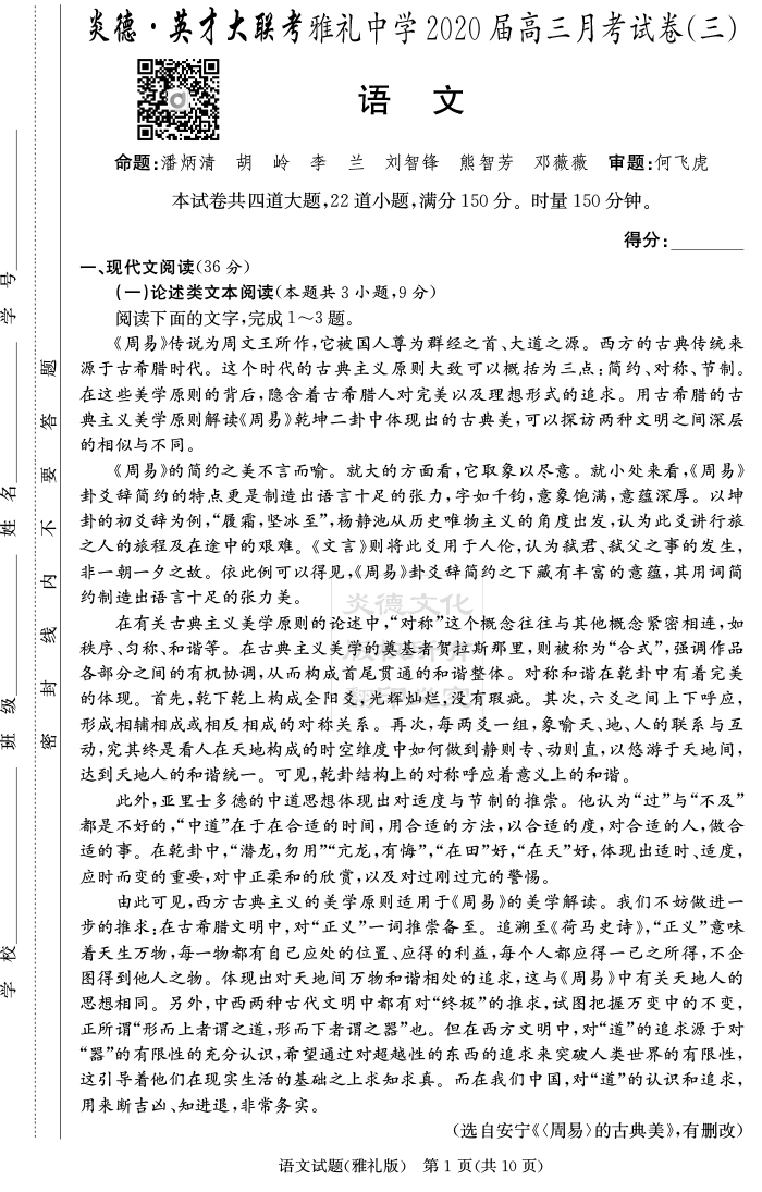 【語文】炎德英才大聯考2020屆雅禮中學高三3次月考