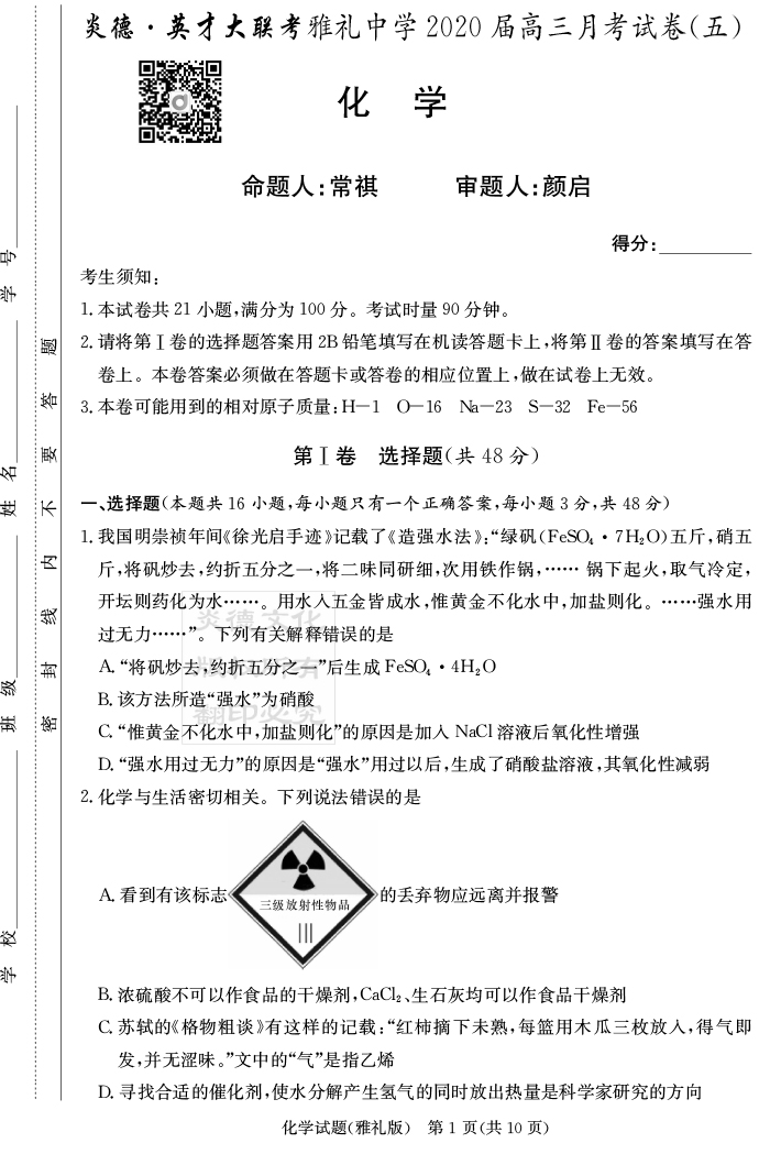 【化學】炎德英才大聯考2020屆雅禮中學高三5次月考