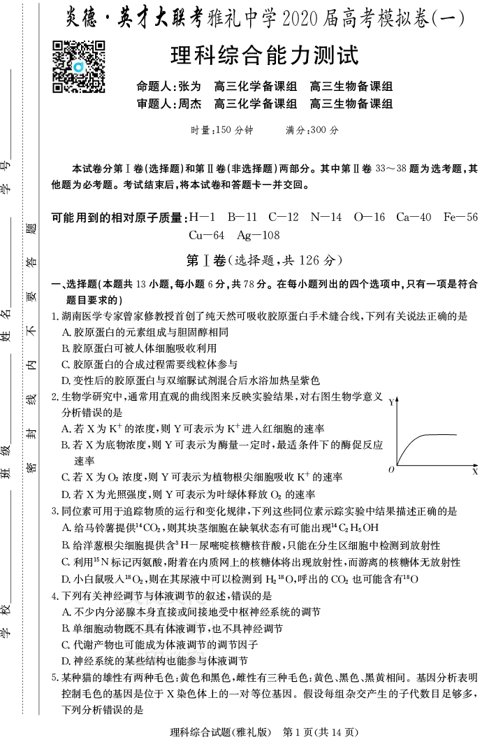 【理綜】炎德英才大聯考2020屆雅禮中學高三10次月考(模擬一)