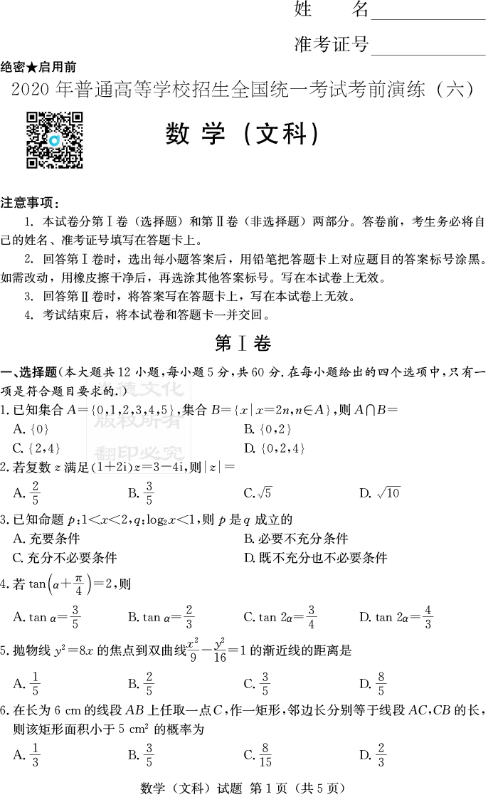 【文數】2020年普通高等學校招生全國統(tǒng)一考試考前演練(六)
