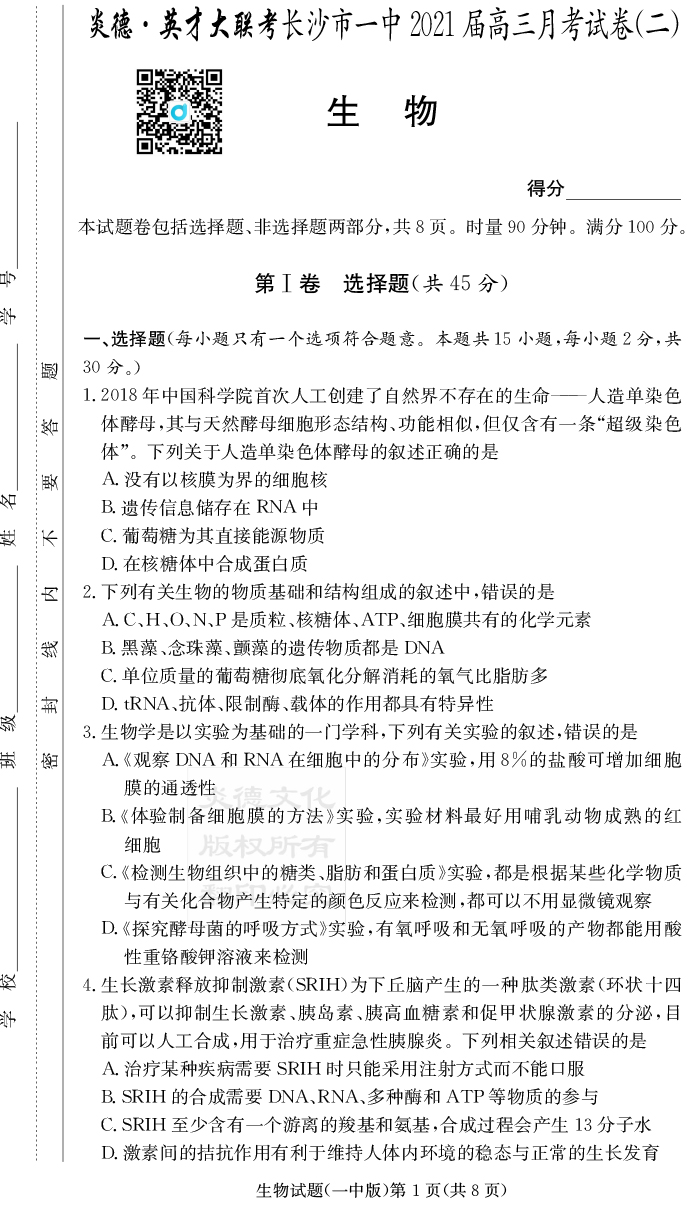 【生物】炎德英才大聯考2021屆長沙市一中高三2次月考