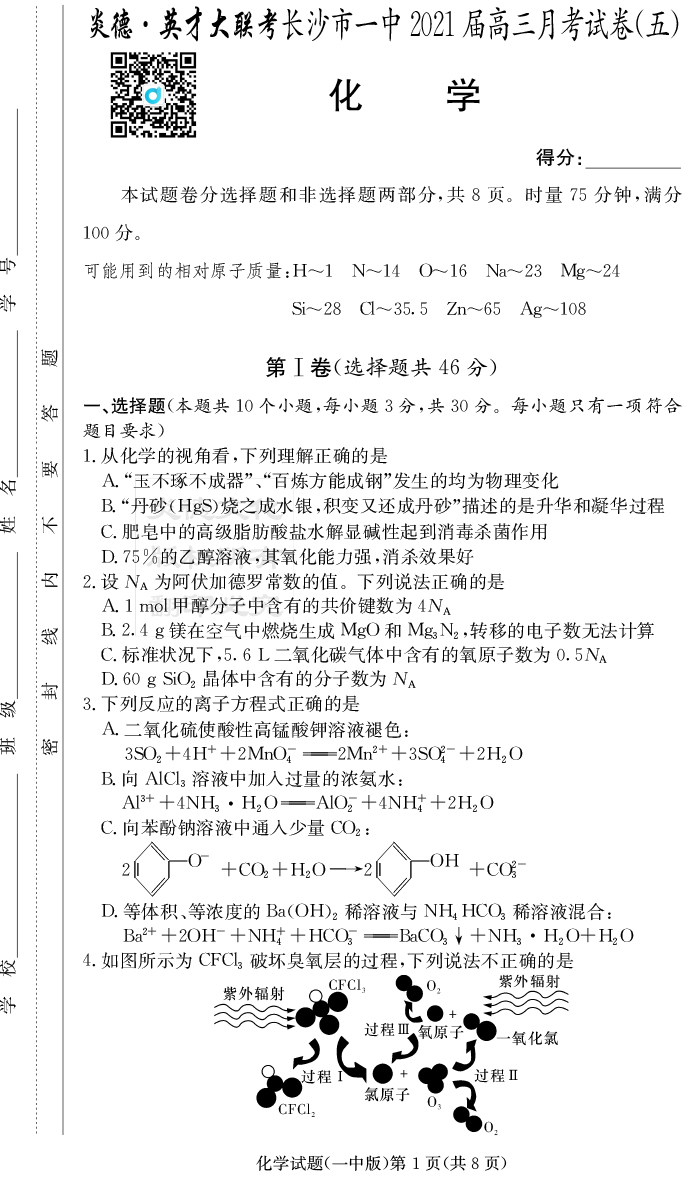 【化學】炎德英才大聯(lián)考2021屆長沙市一中高三5次月考